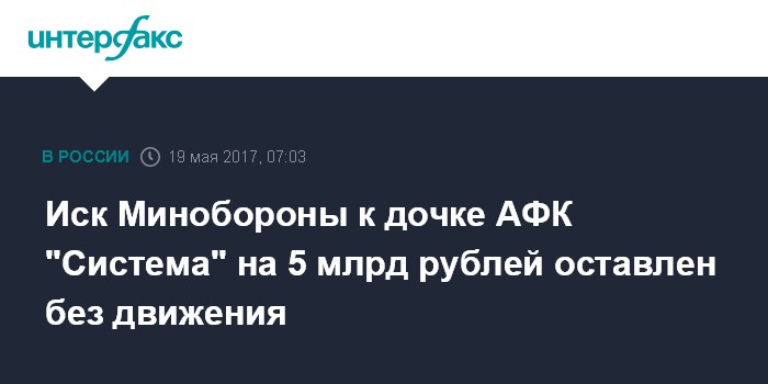 Москва. 19 мая. INTERFAX.RU - Арбитражный суд Москвы оставил без движения иск Минобороны РФ к частному оборонному холдингу "РТИ" (входит в АФК "Система"), говорится в решении суда. Согласно документу, опубликованному на сайте суда, иск оставлен без движения до 15 июня 2017 года в связи с тем, что военное ведомство не представило все необходимые бумаги. В частности, отсутствует акт сдачи - приемки работ от 2015 года.