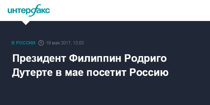 Москва. 19 мая. INTERFAX.RU - Президент Филиппин Родриго Дутерте прибудет с визитом в Россию с 22 по 26 мая, во время которого встретится с руководством страны, передает в пятницу американская телекомпания CBN.