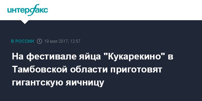 Москва. 19 мая. INTERFAX.RU - В райцентре Сатинка Тамбовской области в воскресенье состоится первый межмуниципальный фестиваль яйца "Кукарекино", сообщает пресс-служба администрации региона.