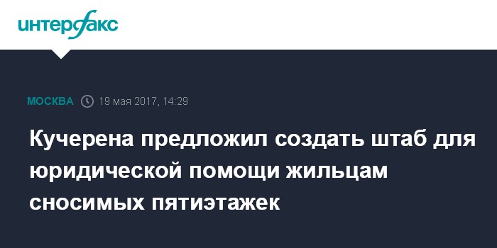 Москва. 19 мая. INTERFAX.RU - Адвокат Анатолий Кучерена выступает с инициативой создать интеллектуальный штаб, который будет заниматься юридической поддержкой москвичей, чьи дома будут включены в программу реновации жилищного фонда города.