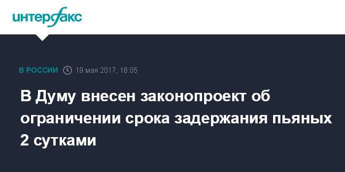 Москва. 19 мая. INTERFAX.RU - Правительство РФ внесло в Госдуму проект закона, согласно которому общий срок вытрезвления лица, находящегося в состоянии опьянения, не должен превышать 48 часов с момента его задержания.