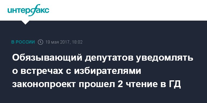 Москва. 19 мая. INTERFAX.RU - Госдума приняла во втором чтении законопроект, обязывающий депутата уведомлять власти о встрече со своими избирателями на улице, на такие встречи предлагается распространить действие закона "О собраниях, митингах, демонстрациях, шествиях и пикетированиях".