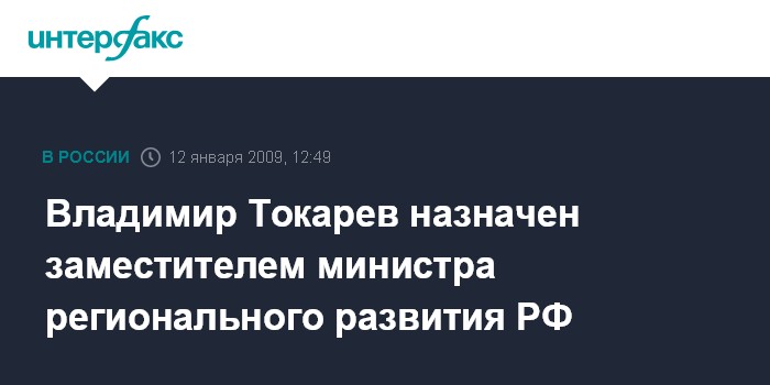 Москва. 12 января. INTERFAX.RU - Председатель правительства РФ Владимир Путин своим распоряжением назначил Владимира Токарева заместителем министра регионального развития. Соответствующее распоряжение было подписано 30 декабря прошлого года.