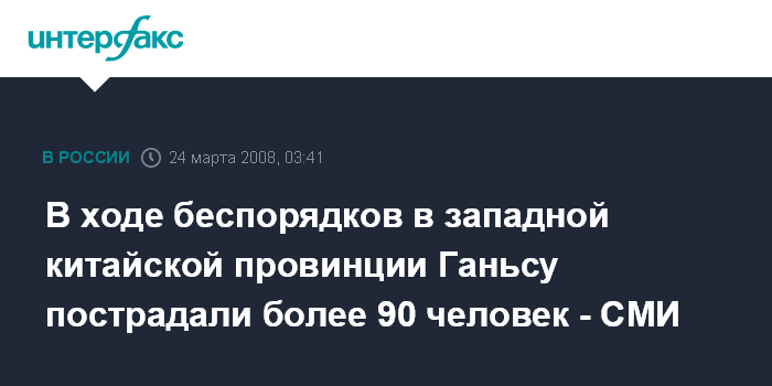 Пекин. 24 марта. ИНТЕРФАКС-КИТАЙ - Во время беспорядков и погромов в западной китайской провинции Ганьсу, которыми сопровождались события в Тибетском автономном районе (ТАР) Китая, пострадали 94 человека, сообщили в понедельник местные СМИ.