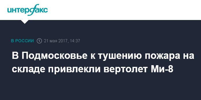 Москва. 21 мая. INTERFAX.RU - Для тушения пожара на складе в подмосковном Лыткарино задействовали вертолет, сообщили "Интерфаксу" в Национальном центре управления в кризисных ситуациях МЧС России.