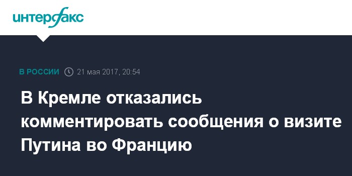 Москва. 21 мая. INTERFAX.RU - В Кремле не комментируют сообщения СМИ об ожидающемся 29 мая визите во Францию президента России Владимира Путина, но обещают своевременно уведомить, если он будет подготовлен.