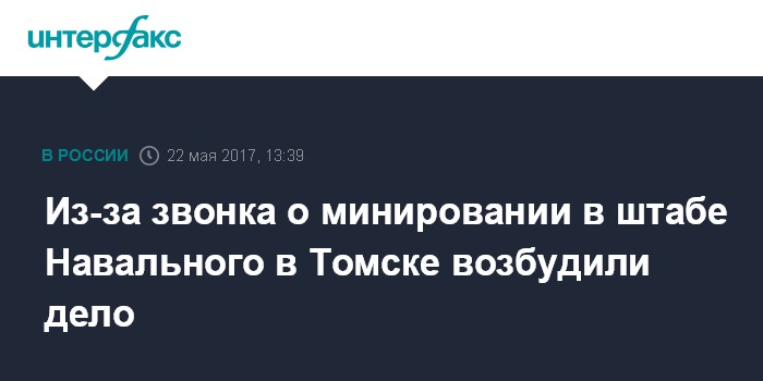 Москва. 22 мая. INTERFAX.RU - Полиция Томска возбудила уголовное дело из-за ложного сообщения о минировании бизнес-центра во время встречи оппозиционера Алексея Навального с активистами в марте, сообщила агентству "Интерфакс" координатор штаба Ксения Фадеева в понедельник.