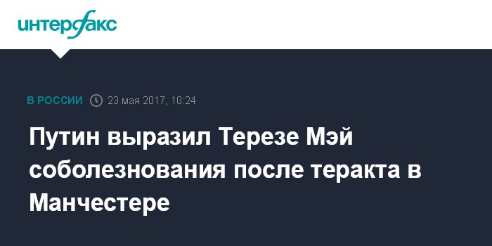 Москва. 23 мая. INTERFAX.RU - Президент РФ Владимир Путин выразил соболезнования премьеру Великобритании Терезе Мэй в связи с трагическими последствиями теракта на стадионе Манчестера и подтвердил готовность к совместной борьбе с терроризмом, сообщает во вторник пресс-служба Кремля.