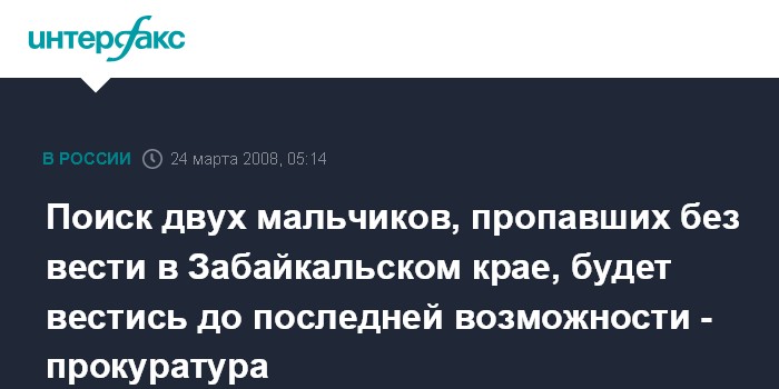 Чита. 24 марта. ИНТЕРФАКС-СИБИРЬ - Прокуратура не намерена прекращать поиск двух мальчиков, пропавших без вести 16 марта в поселке Карымское Забайкальского края