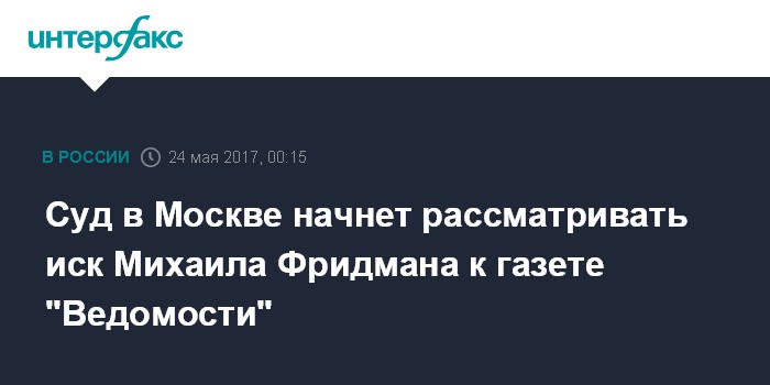 Москва. 24 мая. INTERFAX.RU - Останкинский суд Москвы начнет рассмотрение по существу иска бизнесмена Михаила Фридмана к газете "Ведомости" о защите чести, достоинства и деловой репутации, сообщил руководитель юридического отдела "Ведомостей" Владимир Румянцев. Как ожидается, суд может прекратить производство по иску бизнесмена в связи с достигнутым сторонами мировым соглашением, для заключения и проработки деталей которого судом им был дан ровно месяц.