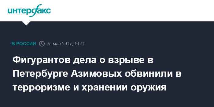 Москва. 25 мая. INTERFAX.RU - Следователи предъявили уроженцам Киргизии Аброру и Абраму Азимовым обвинение в терроризме и хранении оружия по делу о теракте в метрополитене Санкт-Петербурга. Об этом сообщил их адвокат Дмитрий Динзе.