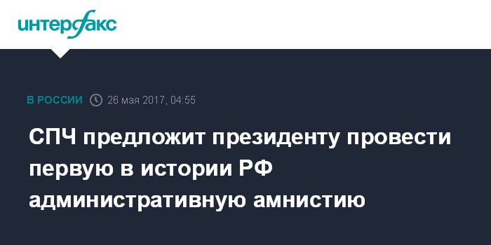 "Совет при президенте РФ по правам человека предлагает главе государства провести административную амнистию. В России ее еще никогда не было, хотя законом такая возможность предусмотрена. (...) СПЧ готов представить главе государства свои наработки по амнистии, которую предлагается приурочить к 100-летию Октябрьской революции", - говорится в публикации.