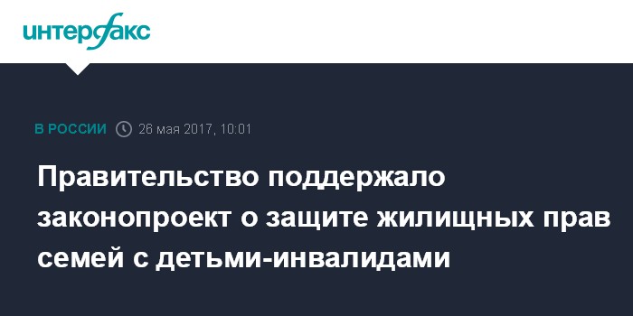 Москва. 26 мая. INTERFAX.RU - Правительство РФ поддерживает законопроект о защите жилищных прав семей с детьми-инвалидами, которым за ними сохраняется право на проживание в жилом помещении специализированного жилфонда до предоставления другого жилья, говорится в сообщении на сайте российского правительства.