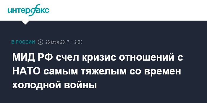 Москва. 26 мая. INTERFAX.RU - МИД РФ распространил в пятницу заявление в связи с 20-й годовщиной подписания в Париже Основополагающего акта о взаимных отношениях, сотрудничестве и безопасности между Россией и НАТО, из которого следует, что российско-натовские отношения переживают самый глубокий кризис со времен холодной войны.