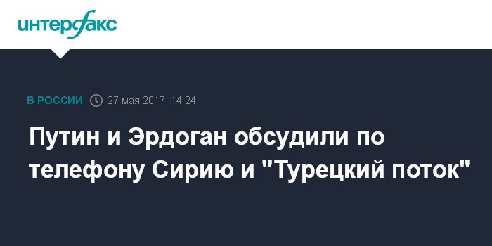 Москва. 27 мая. INTERFAX.RU - Президент РФ Владимир Путин и президент Турции Реджеп Тайип Эрдоган обсудили в субботу по телефону сирийскую проблематику и двусторонние отношения.