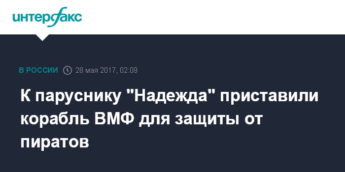 Москва. 28 мая. INTERFAX.RU - Океанографическое исследовательское судно (ОИС) Военно-Морского Флота (ВМФ) России "Адмирал Владимирский" сопровождает учебное парусное судно "Надежда" в Аденском заливе, сообщил представитель департамента информации и массовых коммуникаций Минобороны РФ по Военно-Морскому Флоту капитан 1 ранга Игорь Дыгало.
