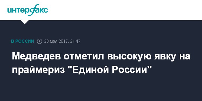 Москва. 28 мая. INTERFAX.RU - Явка на предварительное голосование партии "Единая Россия" свидетельствует об интересе граждан к избирательной кампании и кандидатам-"единороссам", заявил премьер РФ, председатель "Единой России" Дмитрий Медведев.