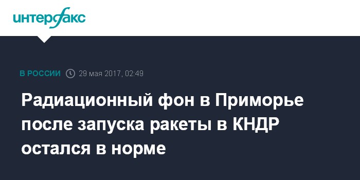 Москва. 29 мая. INTERFAX.RU - Радиационный фон в Приморье не превышает обычных показателей после проведенного в понедельник КНДР запуска баллистической ракеты.