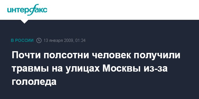 Медики пояснили "Интерфаксу", что почти полсотни пострадавших от гололеда насчитывалось в столице на 22:00 мск. "К утру их будет значительно больше", - считает собеседник агентства.