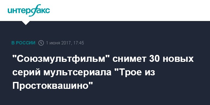 Москва. 1 июня. INTERFAX.RU - "Союзмультфильм" снимет продолжение мультсериала "Трое из Простоквашино"; 30 серий мультфильма выйдут в период с 2018 по 2020 год и будут сняты в смешанной технике, комбинирующей 2D и 3D изображения.