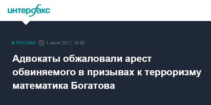 Москва. 1 июня. INTERFAX.RU - Защита обжаловала продление срока содержания под стражей преподавателю математики Дмитрию Богатову, который обвиняется в призывах к терроризму и попытке организации массовых беспорядков, заявил его адвокат Алексей Липцер.