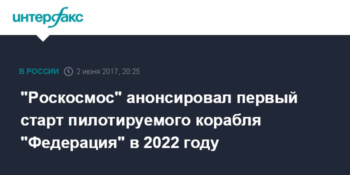 Москва. 2 июня. INTERFAX.RU - Новый российский пилотируемый корабль "Федерация" отправится в космос с космодрома "Байконур", сообщил журналистам глава "Роскосмоса" Игорь Комаров. "Есть решение о том, чтобы первый пуск пилотируемого корабля "Федерация" осуществлять на ракете-носителе "Союз-5" в 2022 году с космодрома "Байконур", - сказал он.