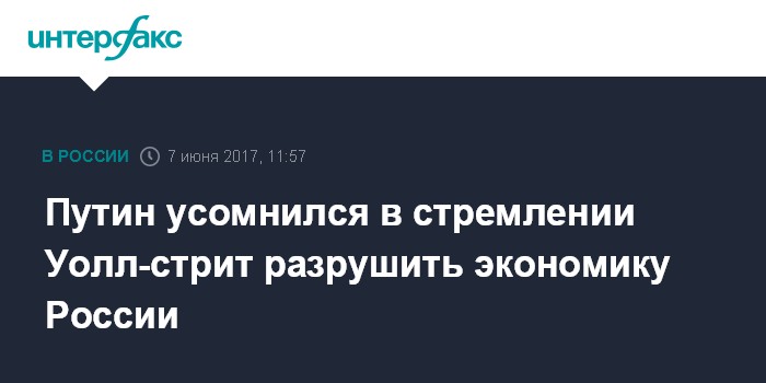 Москва. 7 июня. INTERFAX.RU - Президент России Владимир Путин в беседе с американским режиссером Оливером Стоуном выразил сомнение в том, что Уолл-стрит активно работает над тем, чтобы разрушить российскую экономику в интересах США.