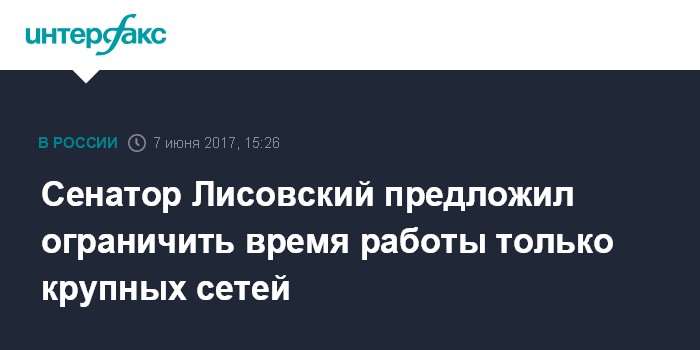 Москва. 7 июня. INTERFAX.RU - Сенатор Сергей Лисовский, предлагавший законодательно ограничить время работы крупных сетей, уточнил свою инициативу: он предлагает распространить ее на гипермаркеты сетей, достигших порога доминирования в 25% локального рынка.