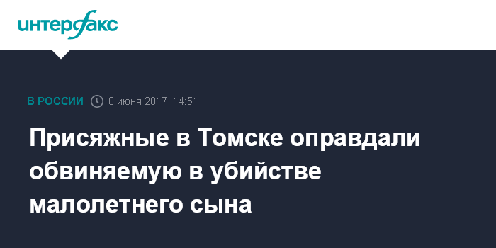 Москва. 8 июня. INTERFAX.RU - Коллегия присяжных заседателей в Томском областном суде в четверг вынесла оправдательный вердикт в отношении местной жительницы, которую обвиняли в убийстве семилетнего сына, сообщает пресс-служба суда.