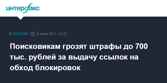 Москва. 8 июня. INTERFAX.RU - За выдачу поисковыми системами ссылок на сайты, предлагающие способы обхода блокировок запрещенной информации, предлагается взимать штрафы в размере до 700 тысяч рублей, говорится в проекте закона, внесенного в Госдуму в четверг.