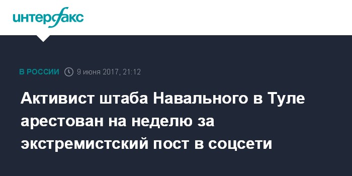 Активист штаба Навального в Туле арестован на неделю за экстремистский пост в соцсети
