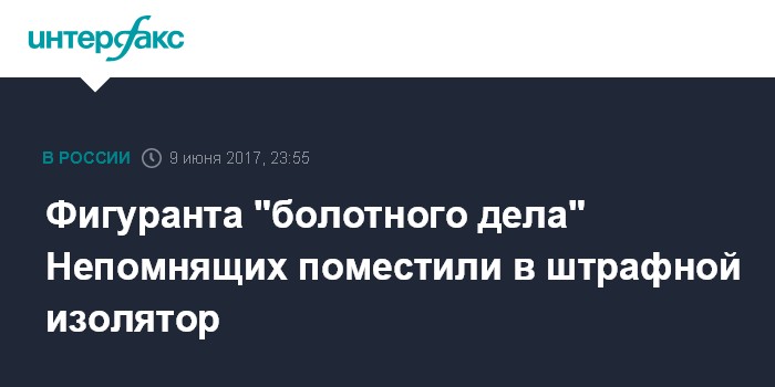 Москва. 9 июня. INTERFAX.RU - Фигуранта "болотного дела" Ивана Непомнящих и еще одного заключённого, ранее заявившего об избиении в ярославской колонии, снова поместили в штрафной изолятор, сообщила в пятницу "Интерфаксу" адвокат фонда "Общественный вердикт" Ирина Бирюкова.