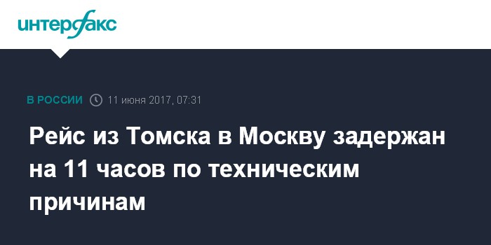 Москва. 11 июня. INTERFAX.RU - Вылет самолета "Аэробус-321", который в воскресенье должен был выполнить совместный рейс авиакомпаний "Аэрофлот" и "KLM Royal Dutch Airlines" из Томска в Москву, отложен с 08:20 до 19:00 (15:00 мск) по местному времени, сообщается на онлайн-табло томского аэропорта.