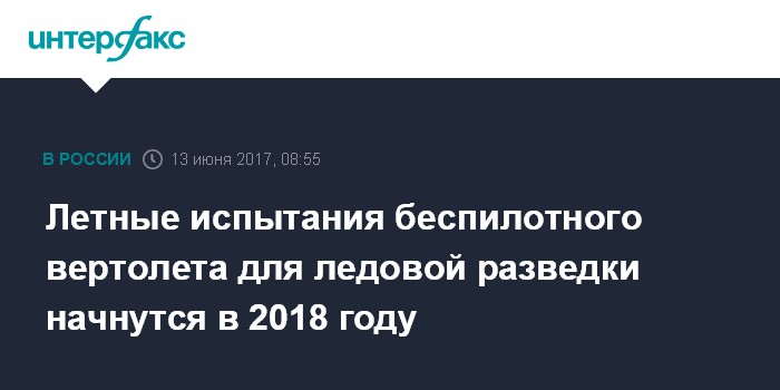 Москва. 13 июня. INTERFAX.RU - Арктический беспилотник производства "Вертолетов России" выйдет на летные испытания в 2018 году, сообщил в интервью "Интерфаксу" гендиректор конструкторского бюро "ВР-технологии" Александр Охонько.