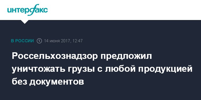 Москва. 14 июня. INTERFAX.RU - Глава Россельхознадзора Сергей Данкверт предлагает уничтожать поднадзорную продукцию, которая перевозится без сопроводительных документов.