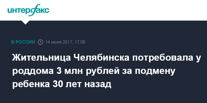 Москва. 14 июня. INTERFAX.RU - Жительница Челябинска Татьяна Туганова направила в суд иск к региональному Минздраву и перинатальному центру о возмещении морального ущерба в связи с подменой 30 лет назад в роддоме ее новорожденной дочери, сообщила "Интерфаксу" консультант Центрального районного суда Наталья Прохорова.