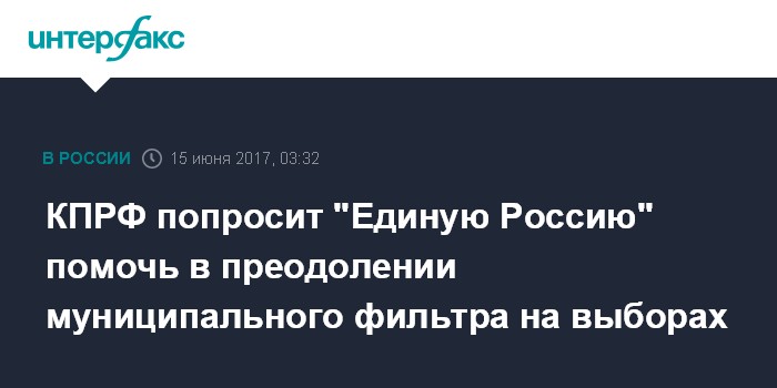 Москва. 15 июня. INTERFAX.RU - ЦК КПРФ намерена обратиться к "Единой России" (ЕР) за помощью в преодолении муниципального фильтра на региональных выборах в сентябре, пишут в четверг "Известия" со ссылкой на собеседника в КПРФ.
