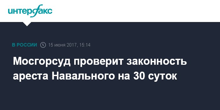 Москва. 15 июня. INTERFAX.RU - Мосгорсуд в пятницу, 16 июня, проверит законность административного ареста на 30 суток оппозиционного политика Алексея Навального, привлеченного к ответственности за повторное нарушение правил проведения митингов и демонстраций, сообщила его адвокат Ольга Михайлова.