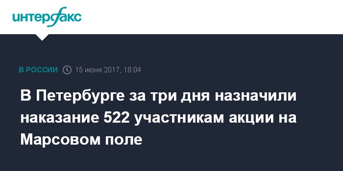 Москва. 15 июня. INTERFAX.RU - Районные суды Санкт-Петербурга за три дня рассмотрели административные дела 529 нарушителей порядка на несогласованной акции на Марсовом поле 12 июня, сообщает пресс-служба Горсуда в четверг.