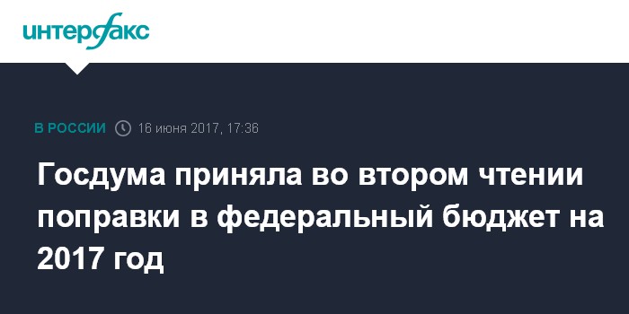 Москва. 16 июня. INTERFAX.RU - Госдума на заседании в пятницу приняла во втором чтении поправки в федеральный бюджет на 2017 год и плановый период 2018-2019 годов.