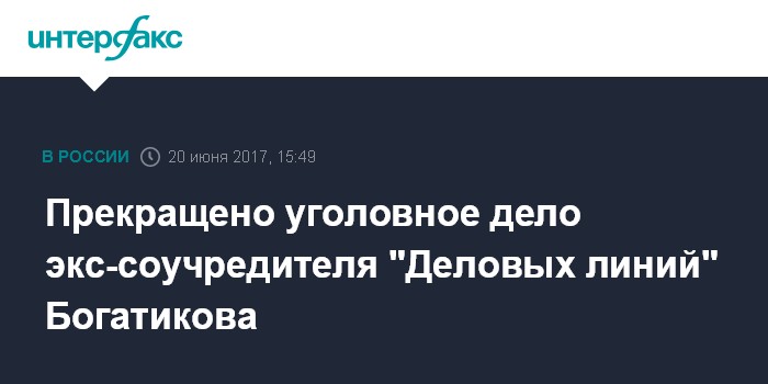 Москва. 20 июня. INTERFAX.RU - Прекращено уголовное дело в отношении бывшего соучредителя компании "Деловые линии" Александра Богатикова. Об этом сообщили "Интерфаксу" в пресс-службе логистической компании во вторник.
