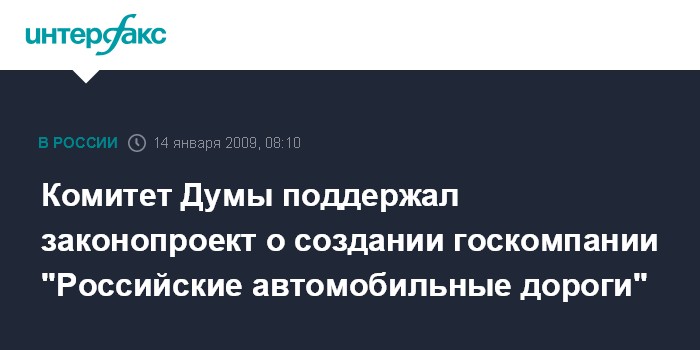 Москва. 14 января. INTERFAX.RU - Комитет Госдумы по строительству и земельным отношениям на заседании во вторник рекомендовал принять в первом чтении законопроект "О государственной компании "Российские автомобильные дороги" и о внесении изменений в некоторые законодательные акты РФ".