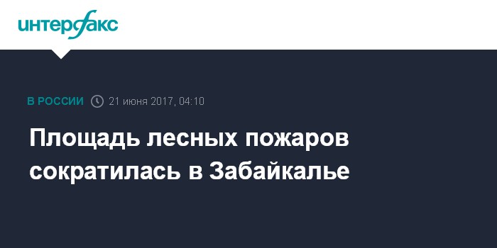 Москва. 21 июня. INTERFAX.RU - В Забайкальском крае за сутки общая площадь лесных пожаров сократилась более чем в 5,5 раз - до 1,7 тыс. га, сообщает пресс-служба регионального Минприроды.