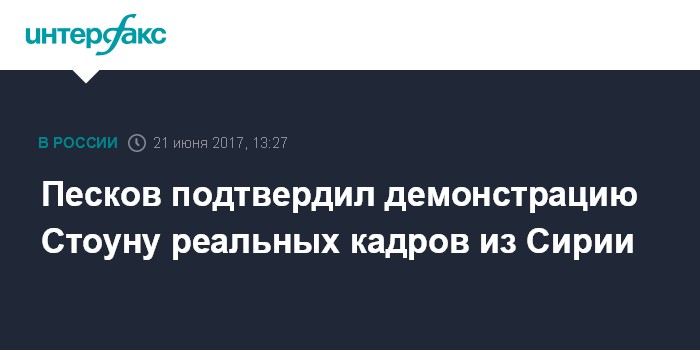 Москва. 21 июня. INTERFAX.RU - В фильме американского режиссера Оливера Стоуна о Владимире Путине показаны реальные кадры действий российской авиации в Сирии, заявил пресс-секретарь президента РФ Дмитрий Песков.