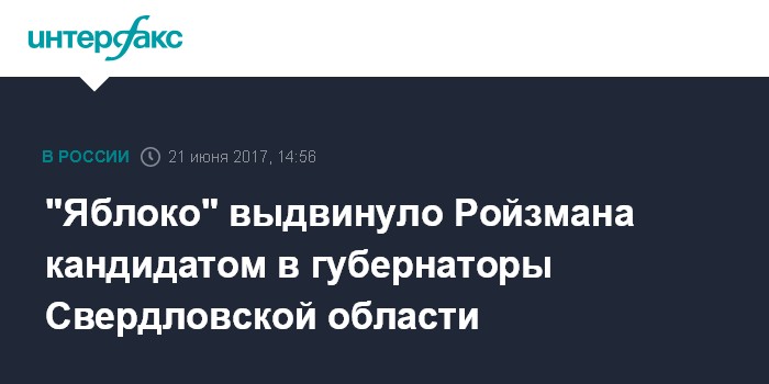 Москва. 21 июня. INTERFAX.RU - Федеральное бюро партии "Яблоко" приняло решение выдвинуть кандидатуру главы Екатеринбурга Евгения Ройзмана на выборах губернатора Свердловской области.