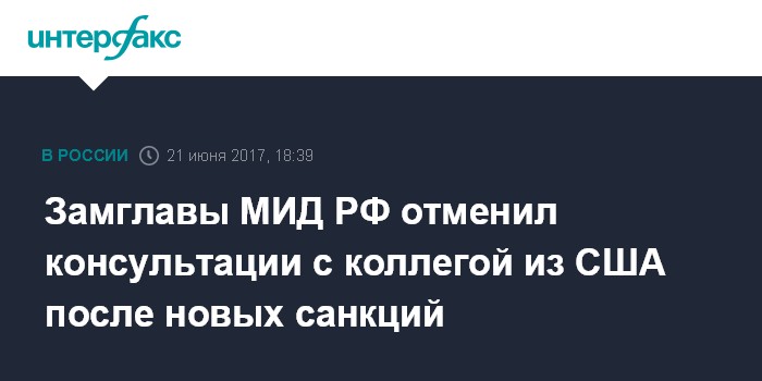 Москва. 21 июня. INTERFAX.RU - Очередной раунд консультаций с замгоссекретаря США Томасом Шэнноном, намеченный на 23 июня, не состоится из-за расширения санкций США в отношении РФ, заявил замглавы МИД РФ Сергей Рябков.