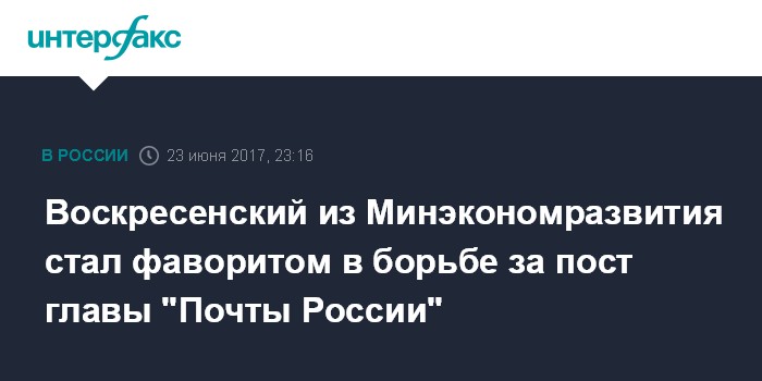 Москва. 23 июня. INTERFAX.RU - Замглавы Минэкономразвития РФ Станислав Воскресенский - основной кандидат на пост главы "Почты России", сообщили "Ведомости" со ссылкой на источники и подтвердил собеседник "Интерфакса", знакомый с ходом обсуждения вопроса о руководителе предприятия.