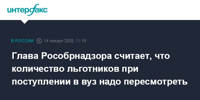Москва. 14 января. INTERFAX.RU - Глава Рособрнадзора Любовь Глебова предлагает пересмотреть количество категорий абитуриентов, которые пользуются льготами при поступлении в вуз.