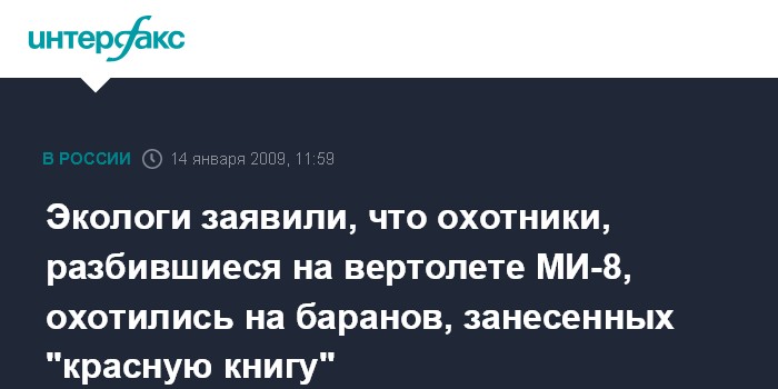 Москва. 14 января. INTERFAX.RU - Экологи заявляют, что охотники, разбившиеся на вертолете Ми-171 в Горном Алтае, незаконно охотились на горных баранов аргали.