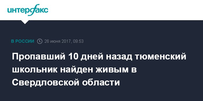 Москва. 26 июня. INTERFAX.RU - Завершены поиски пропавшего 16 июня в городе Заводоуковске Тюменской области школьника, подросток найден живым и здоровым, сообщает в понедельник следственное управлении СКР по региону.